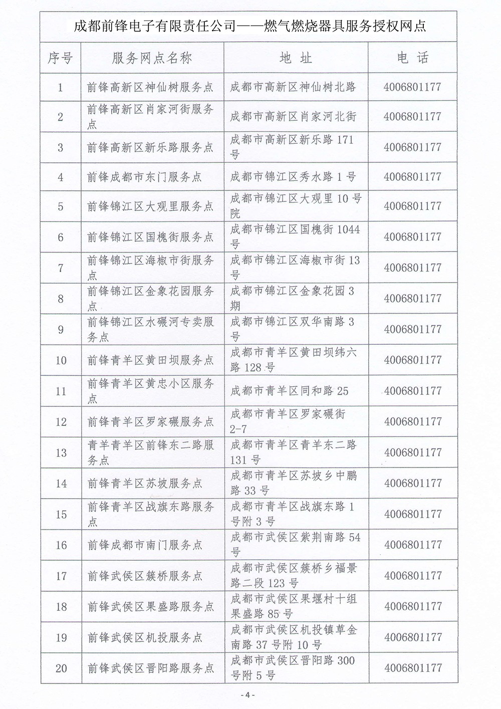 成都前鋒電子有限責(zé)任公司 燃?xì)馊紵骶叻?wù)授權(quán)網(wǎng)點(diǎn)總覽