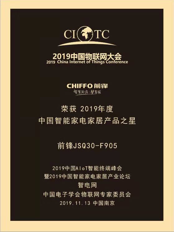 (前鋒零冷水熱水器F905獲2019年度“中國智能家電家居產品之星”稱號)